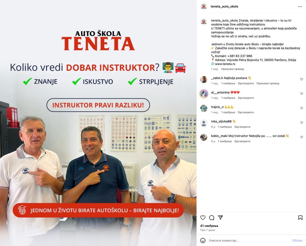 Kroz stručan i kvalitetan rad, auto škola „TENETA“ polaznicima štedi novac i vreme i pruža najbolju pripremu budućih vozača čime maksimalno čuva njihovu ličnu bezbednost i bezbednost svih učesnika u saobraćaju. U okviru programa obuke svim polaznicima su uvek gratis bila dostupna učila(knige,testovi za vežbu…) i kompletna teoretska priprema. Uveli smo kao novinu da svim polaznicima pred polaganje teoretskog ispita omogućavamo 10 do 15 gratis časova priprema. To je veoma često rezultiralo stopostotnom prolaznošću na teorijskim ispitima. U okviru svog rada škola je pripremala učenike osnovnih i srednjih škola za takmičenja iz oblasti saobraćaja, gde su mahom osvajana prva mesta. Naravno, usluge škole, predavanja i literatura su uvek bile gratis. Na takmičenjima auto škola, u tri navrata, koliko je puta i učestvovala, Vladimir Nikolić je osvojio prvo mesto.