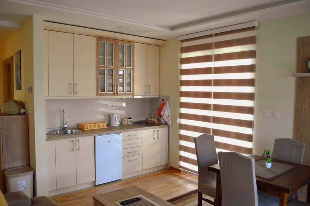 Kuhinja je opremljena električnim kuvalom za vodu, kompletim priborom, posuđem, šporetom i frižiderom.