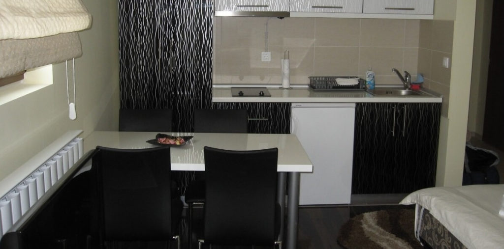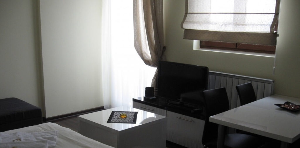 Apartman je studijskog tipa. Sastoji se od kuhinje, trpezarije, dnevne soba, prostora za spavanje – sve u jednoj prostoriji. Takođe, u okviru apartmana su i kupatilo. Nalazi se na drugom spratu. Površine je 26m2. U apartmanu može boraviti do tri osobe. Na raspolaganju je jedan bračni krevet i pomoćni ležaj. Gostima su na raspolaganju i LCD TV sa satelitskim kanalima, wi-fi internet, fružiderom i fenom za kosu. Zagrejanost apartmana moguće je podešavati na željenu temperaturu.