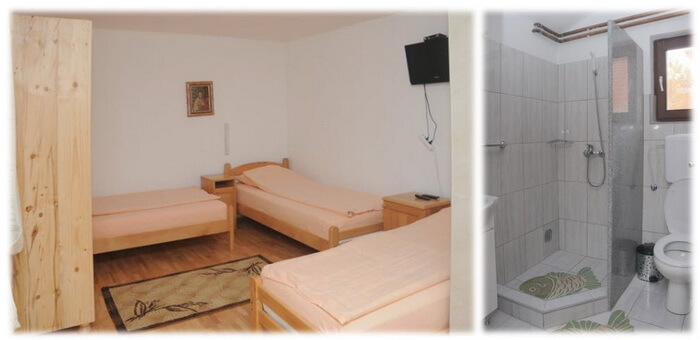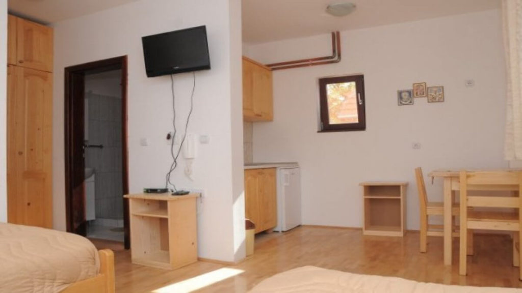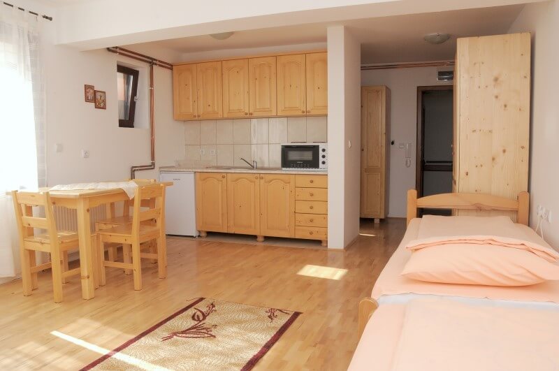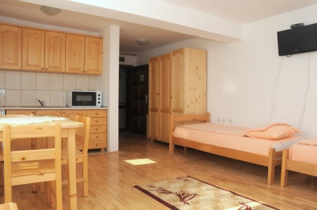 Površine su od 25 do 30 kvadrata i oplemenjeni drvenim parketima i tepisima, što ih čini toplim i veoma prijatnim. Pored udobnih kreveta, tu su i natkasne i garderobni ormar, pa se u svakom studiju možete sasvim lepo raspremiti i raskomotiti. Mala, čajna kuhinja opremljena je frižiderom, šporetnom pločom i osnovnim posuđem kako biste na miru popili jutarnju kafu, uživali u čaju ili svežem voću, a svoj boravak kod nas možete zasnovati i na doručku ili pansionskoj usluzi. Sastavni deo svakog studija je i privatno, moderno uređeno kupatilo sa tuš kabinom.