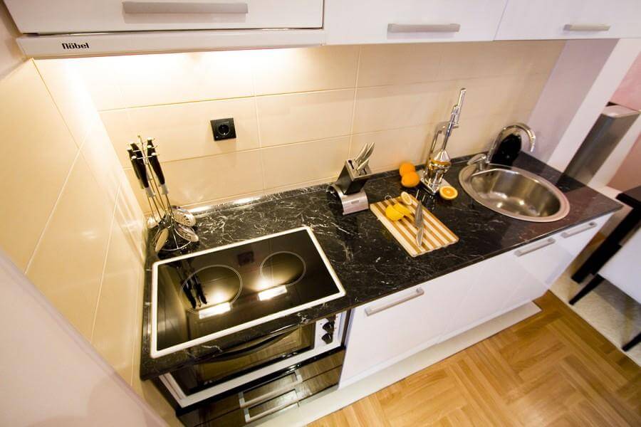 • Potpuno opremljena kuhinja, set za 4-6 osoba, escajg za 4-6 osoba, toster, ketler za čaj, čaše i šolje za sokove, tople napitke, kafu, vino , kratka pića…